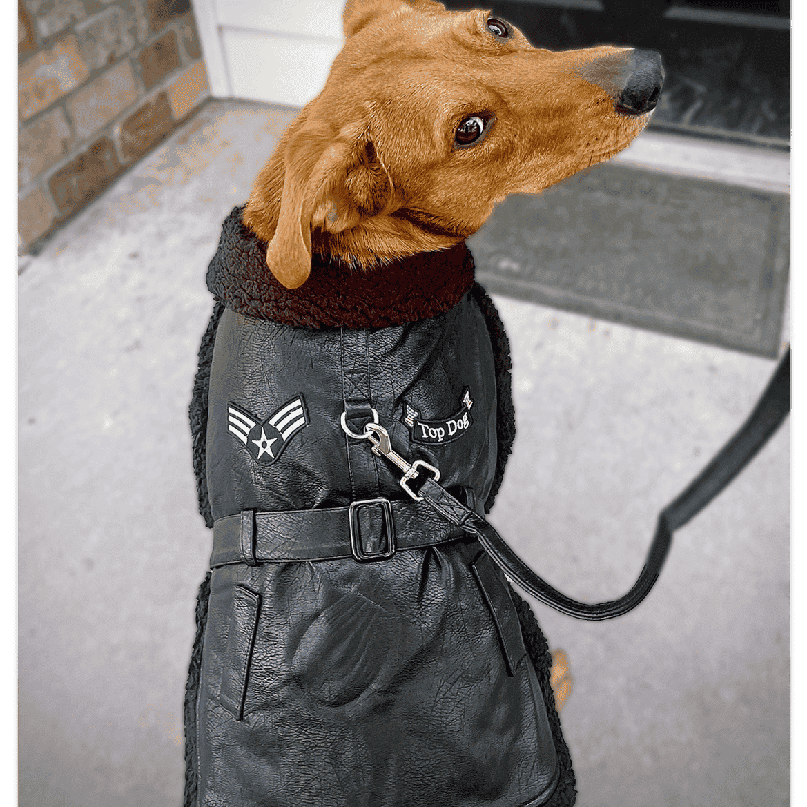 This belted dog coat is crafted in luxury faux leather and faux sherpa trim and includes a matching leash. The inside is lined with a faux sherpa material for an ultra-soft feel. Touch fastener provides adjustable closure at the neck and belt. Custom embroidered patches add an authentic feel to this flight coat.